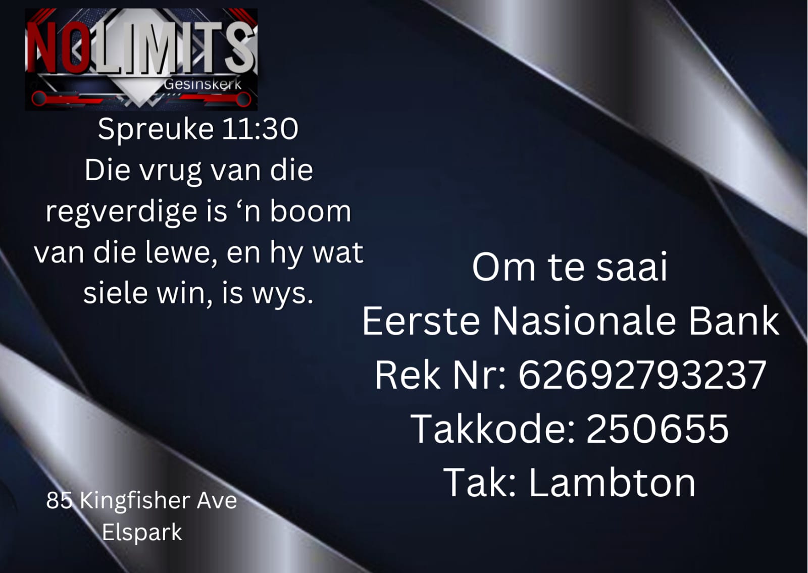 Na suksesvolle betaling, stuur asseblief u bewys van betaling aan info@nolimitsgesinskerk.co.za met u naam en waar u wil hê u skenking gebruik moet word.